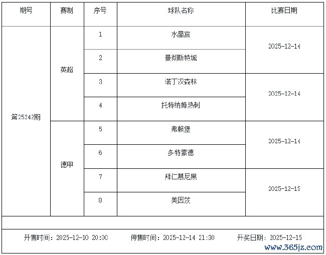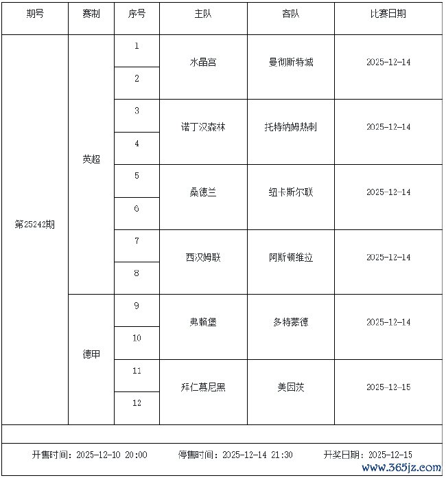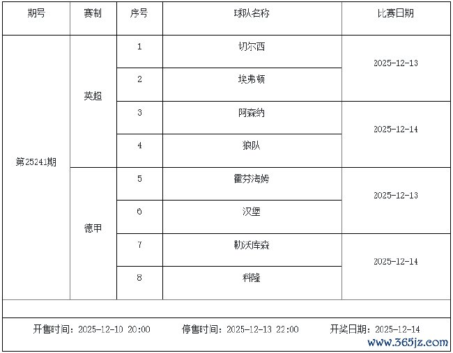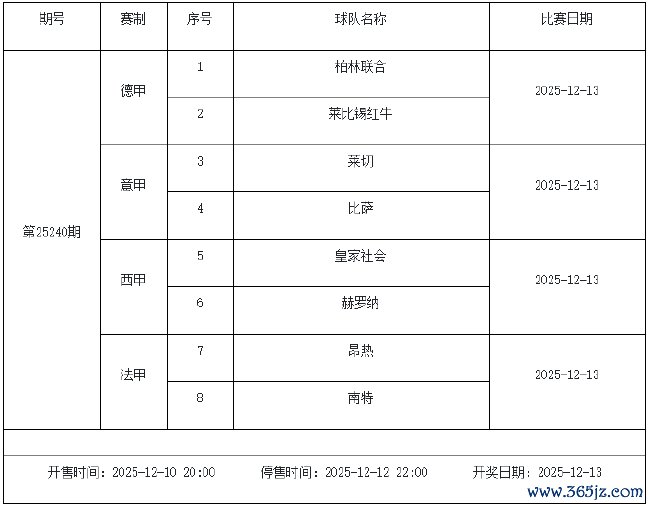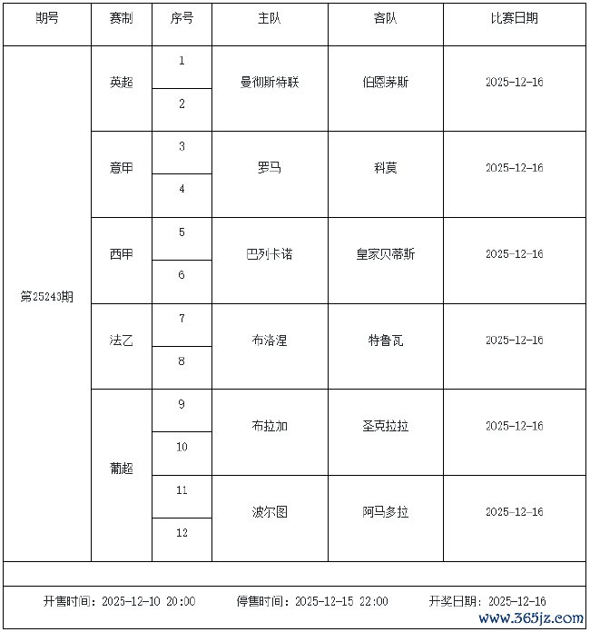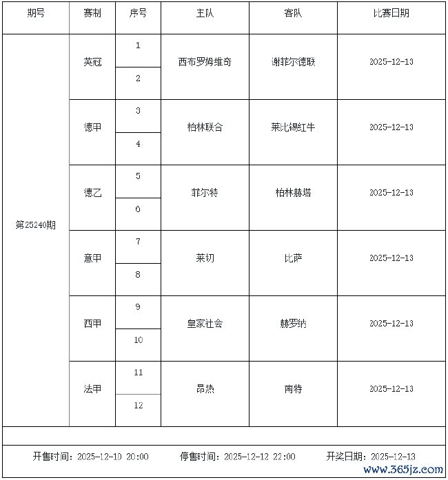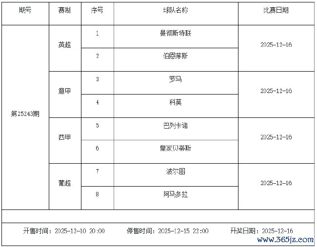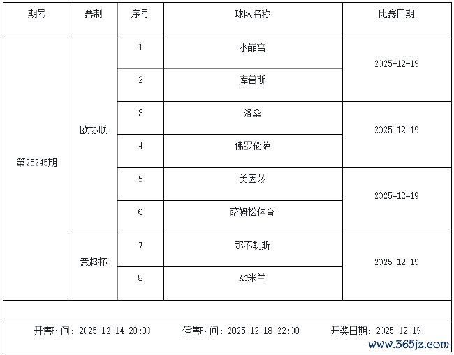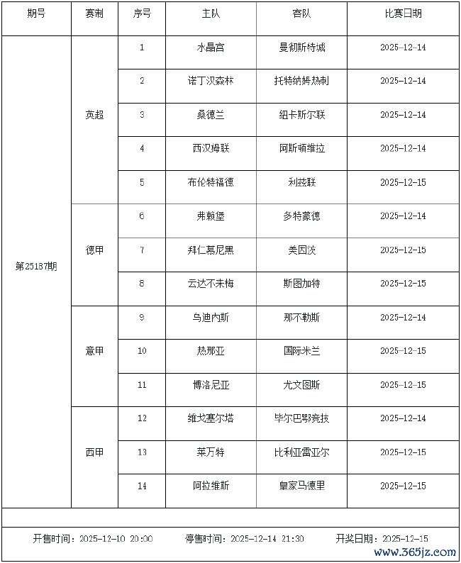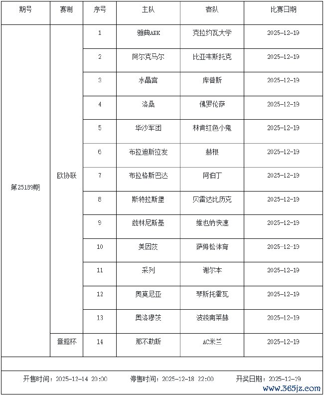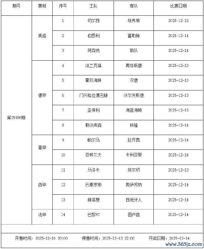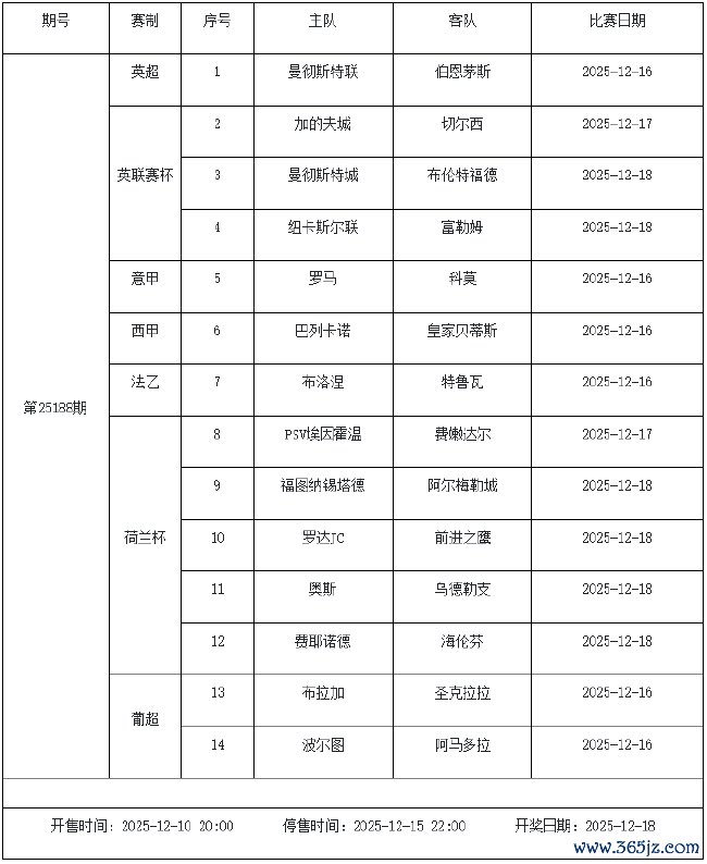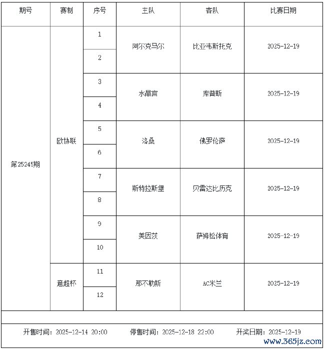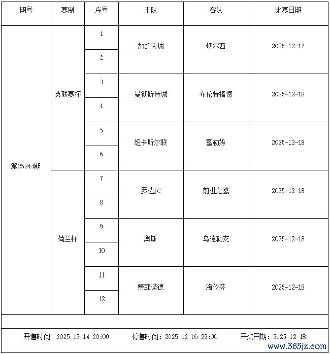 我中心制定了2025年中国足球彩票输赢游戏(14场、任选9场)、6场半全场输赢游戏和4场进球游戏12月12日-12月18日的竞猜场次安排(具体附后),其竞猜对象、开售技能、停售技能和计奖技能均以本文为准。